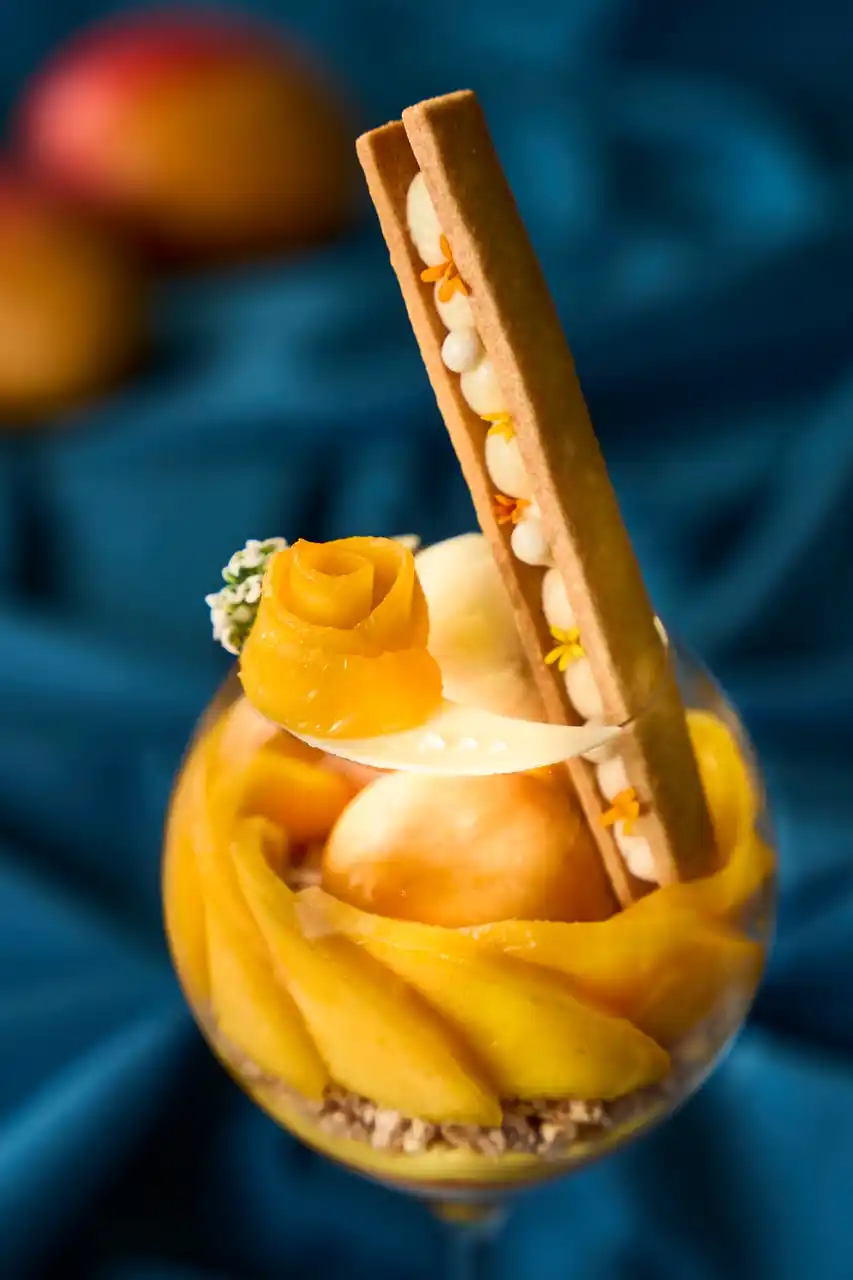 グラスの頂には、マンゴーを薔薇の花のように仕立てたスライスが咲き誇ります。マリーゴールドの花びらをあしらい、バタークリームをはさんだココナッツクッキーが添えられ、南国の風が吹き込むような華やかな表情を演出。注文を受けてからパティシエが一杯ずつ丁寧に組み上げるため、どの角度から見ても美しい仕上がりをお届けします。 |