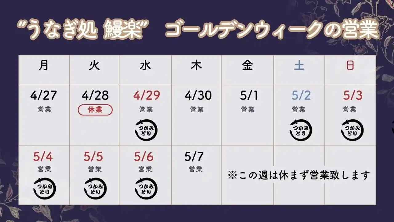 | うなぎ処 鰻楽では、ゴールデンウィーク期間中、通常と一部異なる営業日程で営業いたします。 | ||||||||||||