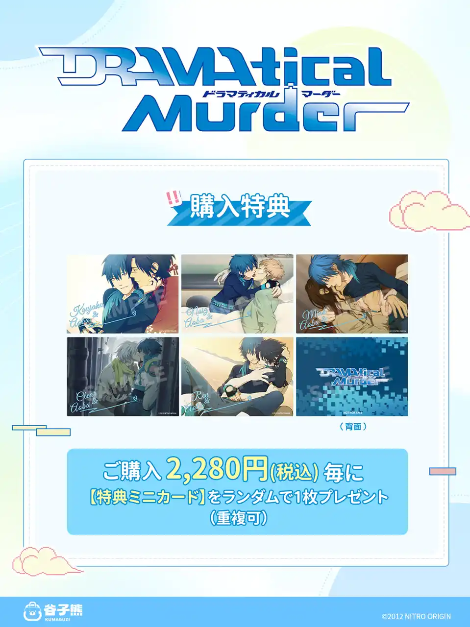 『DRAMAtical Murder』新規ライセンスグッズをご購入2,280円(税込)毎に、【特典ミニカード】をランダムで1枚プレゼントいたします。(重複可) |