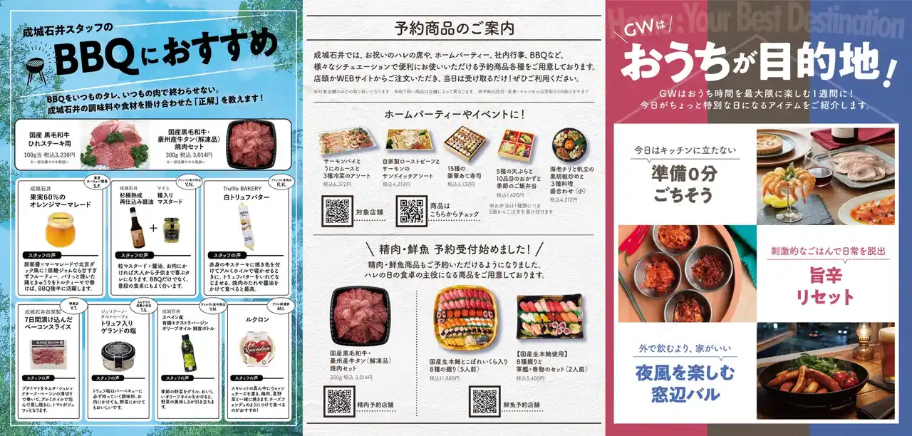 株式会社成城石井(本社事務所:神奈川県横浜市西区みなとみらい、代表取締役社長:後藤勝基)は、2026年のゴールデンウィーク(以下、GW)に向けて、おうちで楽しむ“美食の旅”をご提案いたします。その取り組みとして、「GWはおうちが目的地!」と題したガイド(リーフレット)を2026年4月24日(金)より配布いたします。 |