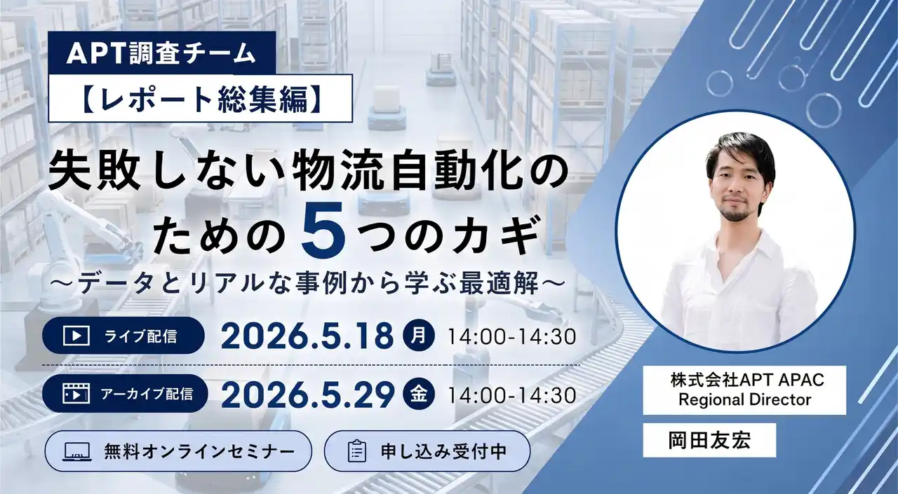 物流システムエンジニアリングを手掛ける株式会社APT(本社:千葉県千葉市、代表取締役社長:井上 良太、以下 APT)は、2026年5月18日(月)に、オンラインセミナー「【APT調査チームレポート総集編】失敗しない物流自動化のための5つのカギ ~データとリアルな事例から学ぶ最適解~」を開催いたします。