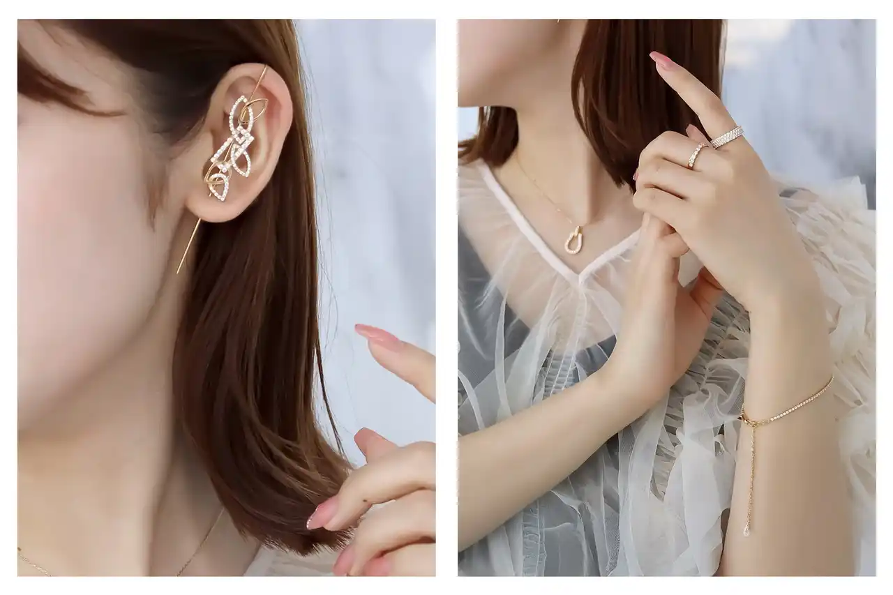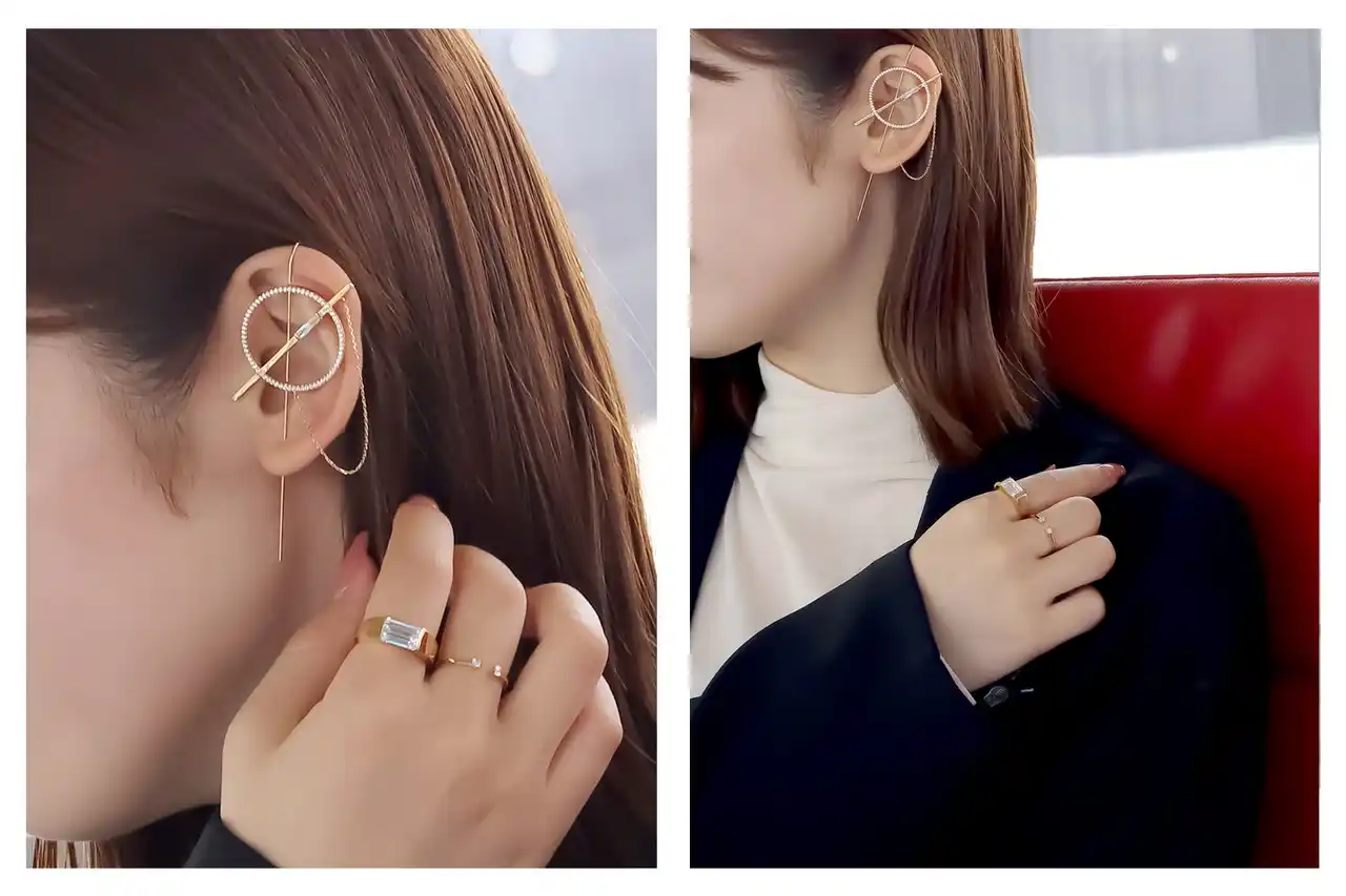 少し特別な夜、おしゃれなバーへ。 大胆なスリットが入ったジャケットとデコルテラインが覗くトップスに、揺れるネックレスとイヤーフックピアスの輝きが印象的に映えるスタイル。 オールブラックコーデにバケットカットのシャープな輝きを重ねることで、洗練された都会的な雰囲気を演出します。 イヤーフックとリングの統一感が、シンプルなスタイリングに奥行きをもたらし、洗練された夜のムードを引き立てます。 |