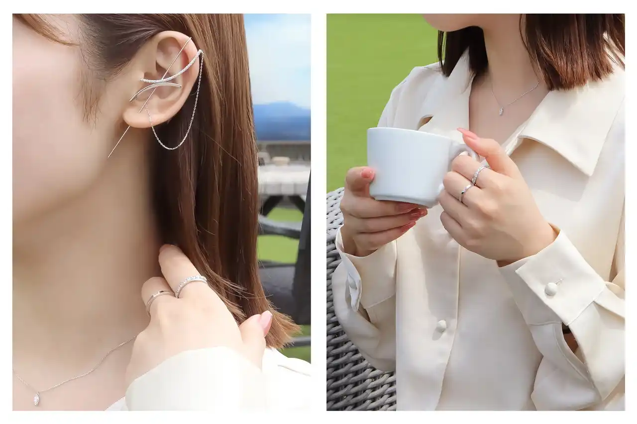 休日のお昼、カフェ巡りやウィンドウショッピングなど、リラックスした時間に寄り添うスタイル。 アイボリーの艶やかなサテンシャツに、やわらかな光を受けて輝くイヤーフックピアスを合わせ、顔まわりに自然な華やかさをプラス。 マグカップを手にした何気ない仕草の中でも、繊細なリングモチーフが上品な存在感を演出し、 肩の力を抜いた装いにさりげないきらめきを添えた、洗練されたデイタイムスタイルに。 |