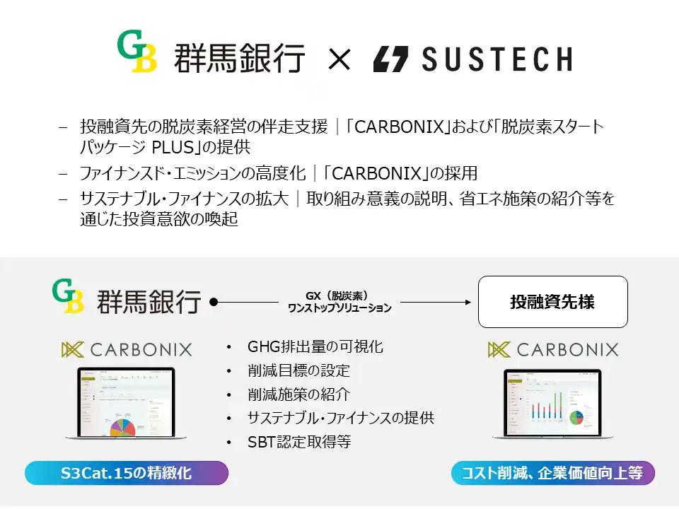 株式会社群馬銀行(群馬県前橋市、代表取締役 頭取:深井 彰彦/以下、群馬銀行)と株式会社Sustech(東京都港区、代表取締役:丹野裕介・飯田祐一郎/以下、Sustech)は、脱炭素化支援プラットフォーム「CARBONIX」を活用し、群馬銀行の取引先における温室効果ガス(以下、GHG)排出量の可視化から削減実行までを一体的に支援する協業を開始したことをお知らせいたします。 |
