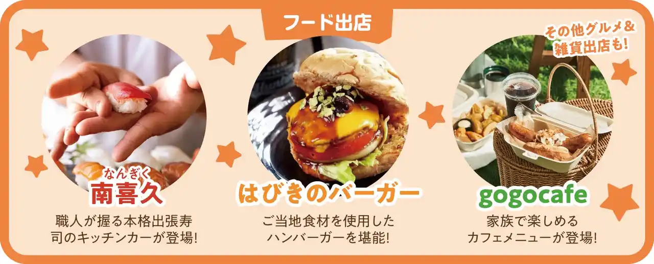 ・南喜久(本格出張寿司のキッチンカー) ・はびきのバーガー(ご当地食材バーガー) ・gogocafe(家族で楽しめるカフェメニュー) ※その他グルメ・雑貨出展予定あり |