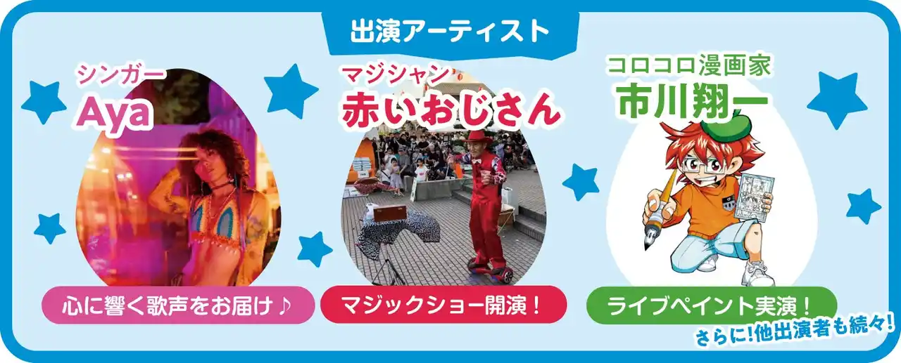 ・マジシャン 赤いおじさん(マジックショー) ・シンガー Aya(ライブステージ) ・コロコロ漫画家 市川翔一(ライブペイント実演) ※さらに他出演者も続々出演予定 |
