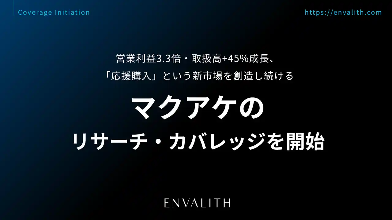 次世代型の株式リサーチ・プラットフォームを展開する株式会社エンヴァリス(本社:東京都渋谷区、代表取締役社長:河井 浩一、以下「当社」)は、株式会社マクアケ(本社:東京都目黒区、代表取締役社長:中山 亮太郎、証券コード:4479)の2026年9月期 第2四半期 決算プレビューレポートを本日配信いたしました。 |