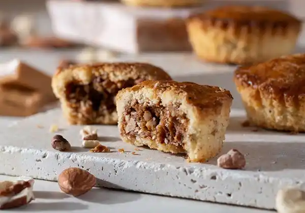 サクほろ食感のガレット生地にはヘーゼルナッツを使用。ナッツの旨みとキャラメルの甘味が織りなす甘美なひととき。 |