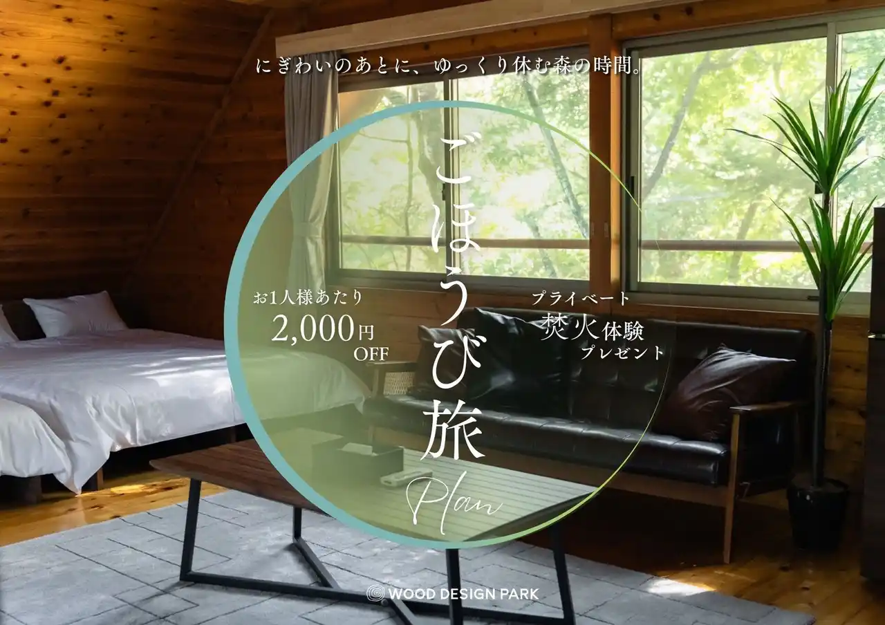 | 「ごほうび旅」は、おひとり様あたり2,000円OFFに加え、プライベート焚火体験が付いた期間限定プランです。 | |||||||||