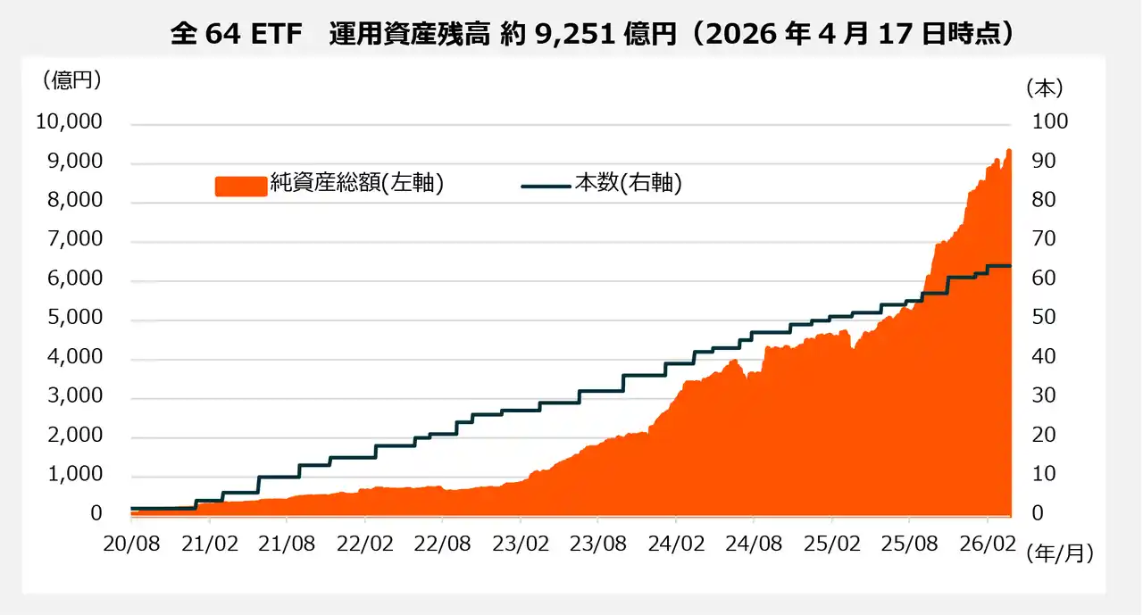 | 投資家の皆さまの多様なニーズに応えるべく、成長テーマ型、インカム型、コア型、コモディティ型など、多岐にわたる革新的なETFラインアップを揃えており、上場銘柄数も本日時点で66本まで拡大しています。 | |||