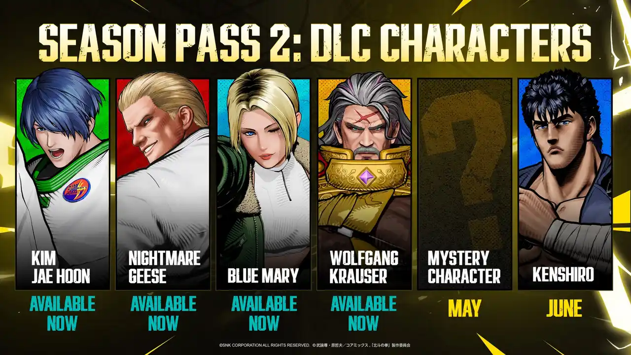 Season Pass 2では、『餓狼伝説』シリーズより「キム・ジェイフン」「ナイトメアギース」「ブルー・マリー」「ヴォルフガング・クラウザー」の4キャラクターに加え、アニメ『北斗の拳 -FIST OF THE NORTH STAR-』よりケンシロウの参戦が決定。さらに後日発表予定のミステリーキャラクター1体を含む、全6キャラクターを毎月順次配信予定です。 |