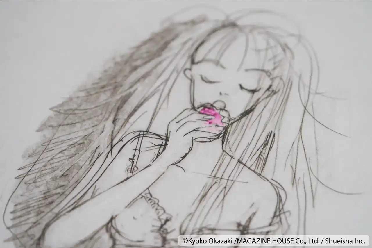 『pink』(マガジンハウス・1989)、『私は貴兄のオモチャなの』(祥伝社・1995)、『うたかたの日々』(宝島社・2003)よりセレクトした4点のイラストレーションを作品化。岩野平三郎製作所(福井)で作られた手漉きの越前和紙を用い、便利堂コロタイプ工房(京都)でプリントしました。コロタイプ印刷は、ガラス板を用い、網点ではなくグラデーションにより色の濃淡を表現するユニークな印刷技法です。鉛筆のラフなタッチから、ペンによる繊細な描線までを再現し、定着させました。 |