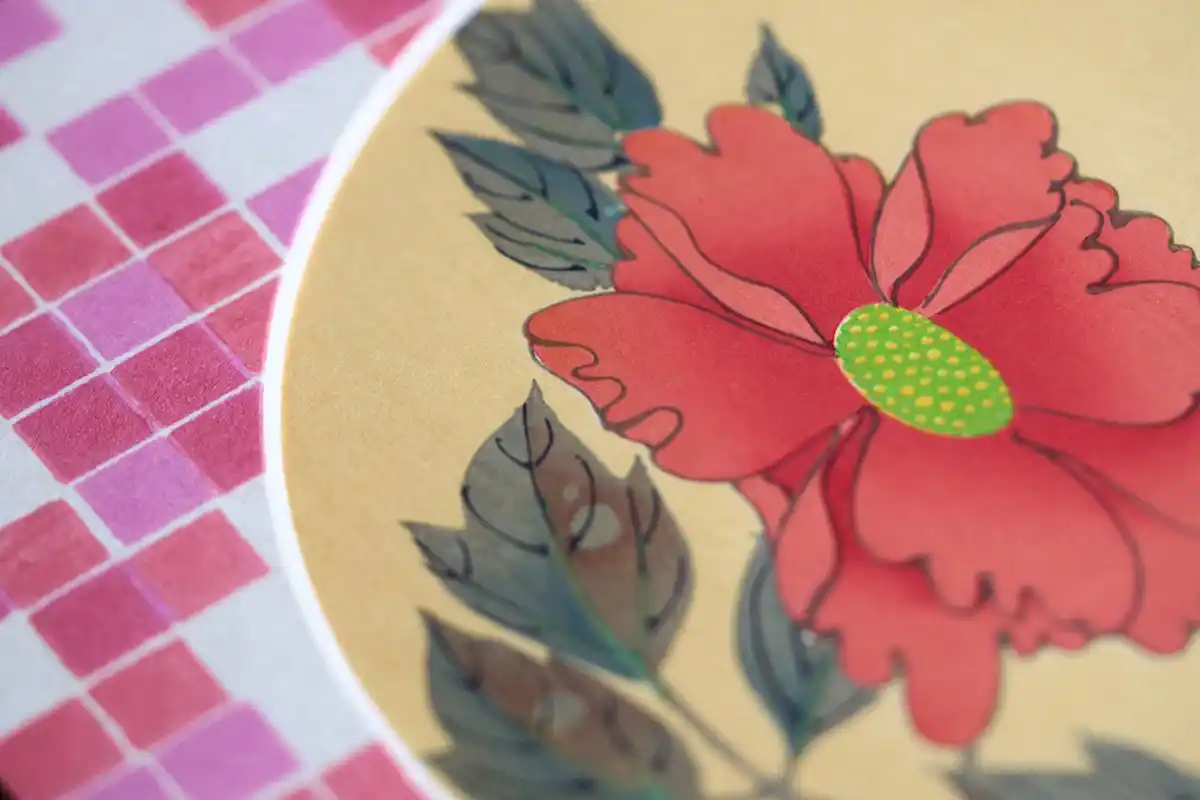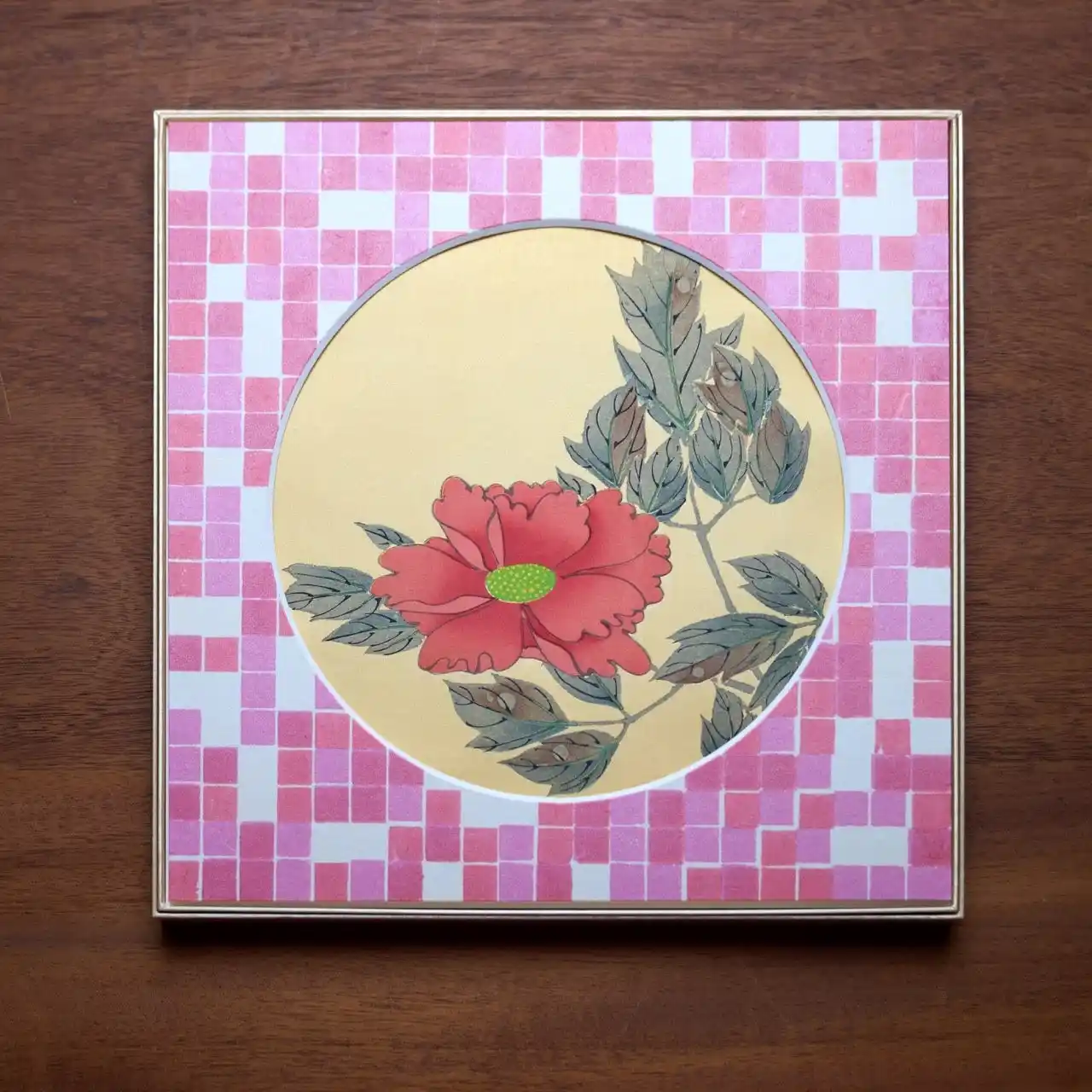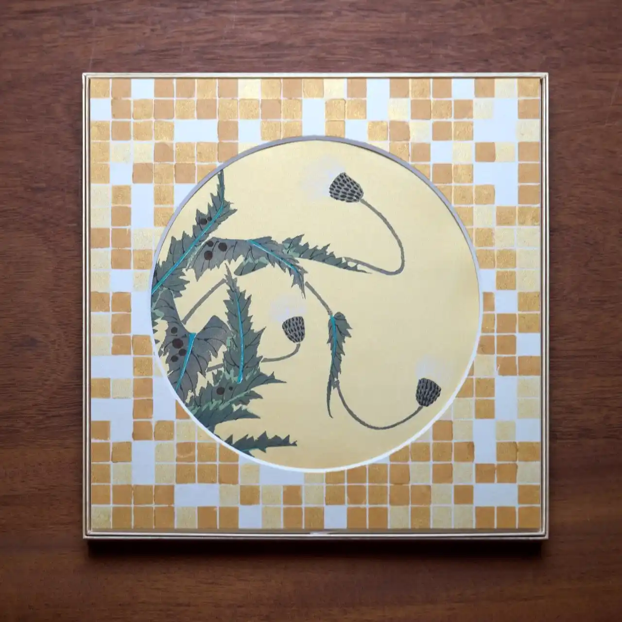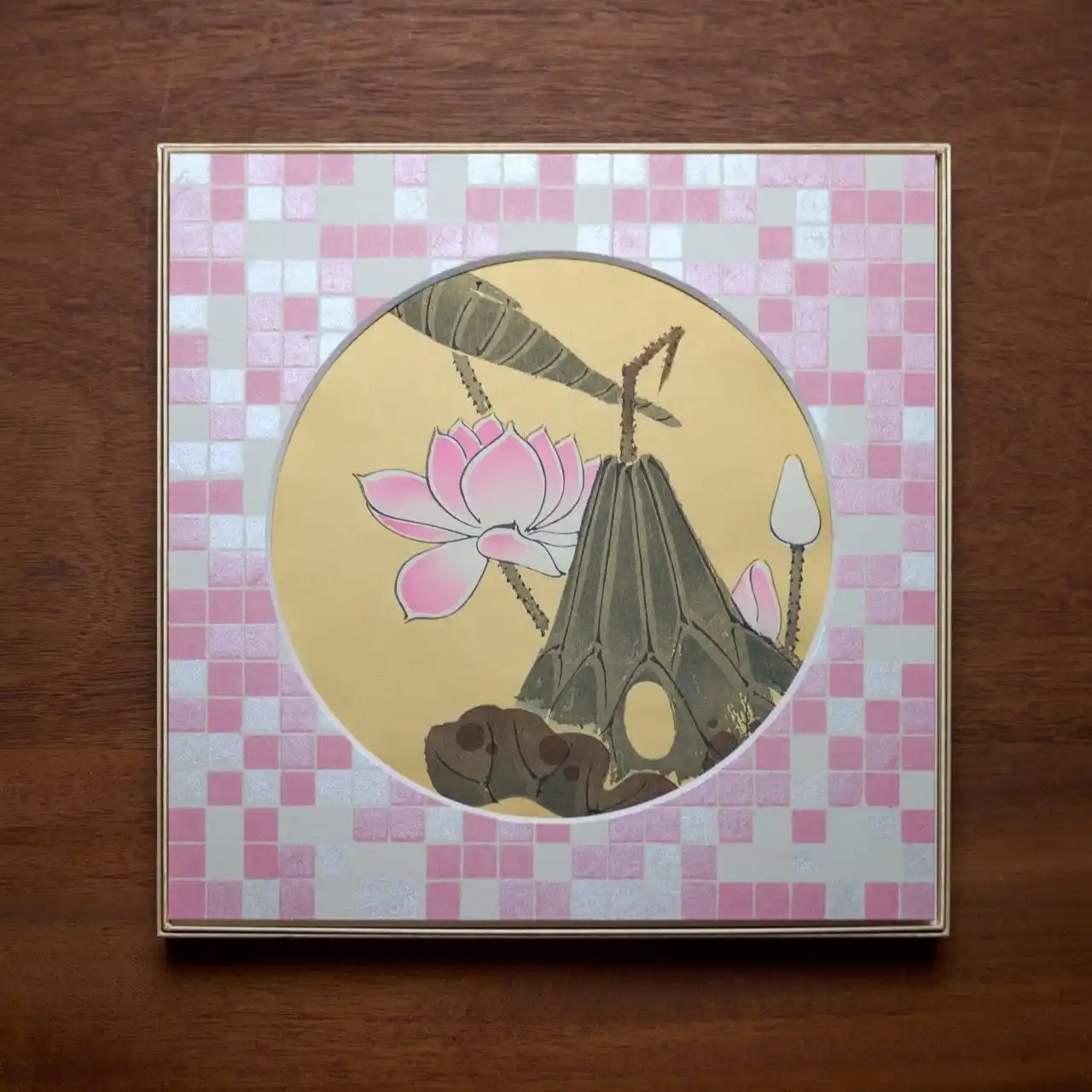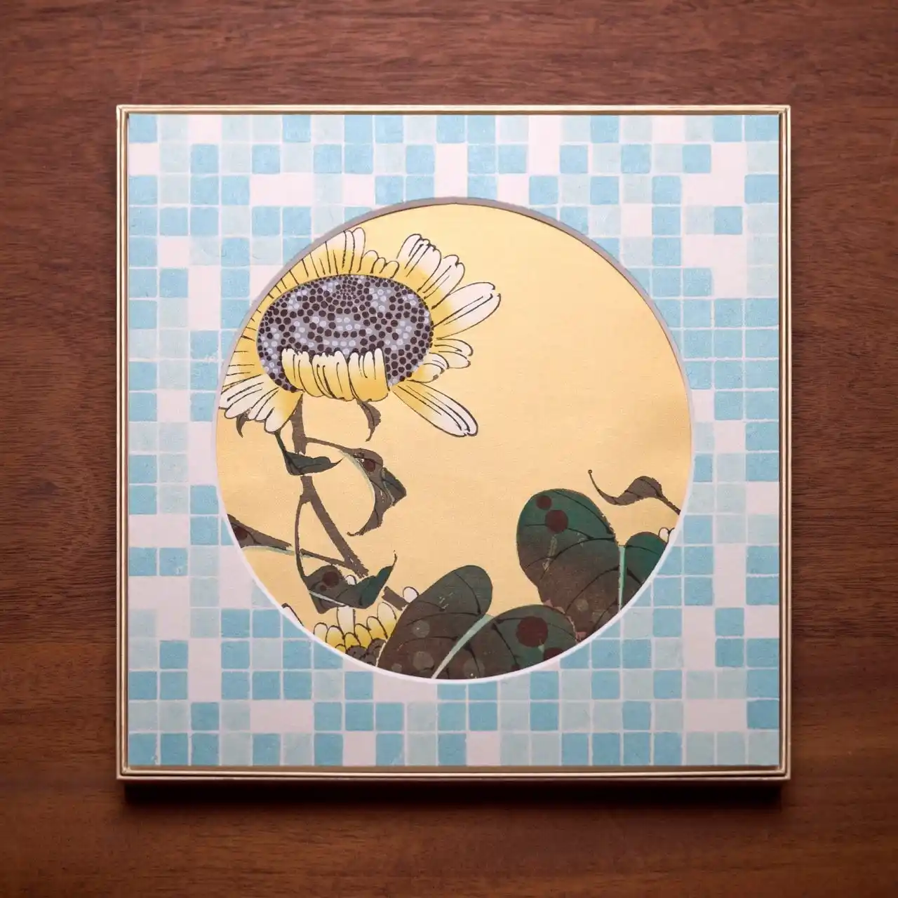 若冲が80歳を過ぎて描いたこの絵は、明治年間に、芸艸堂(うんそうどう)により彩色木版画『若冲画譜』としてまとめられました。この板木を用い、伝統的な浮世絵の技法を用いて制作。集英社マンガアートヘリテージの要望により、背景色を鮮やかな金で刷ったものが今回の展示作品です。あわせて円形のサイズがLPレコードに近いことに着目し、升目描きをイメージしたオリジナルの京唐紙(きょうからかみ)で仕立てたマットボードに収めました。 |