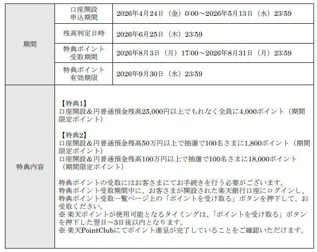 楽天銀行は本年3月12日に、多くのお客さまのご愛顧により、預金口座数が1,800万口座を突破しました。これを記念し、より多くの方々に楽天銀行の利便性を知っていただく機会として、口座開設申込期間内に口座開設を申込のうえ、2026年6月25日(木)23:59時点の円普通預金残高が25,000円以上のお客さま全員にもれなく4,000ポイントを進呈します。さらに、円普通預金残高に応じて抽選で最大18,000ポイントをプレゼントします。 |