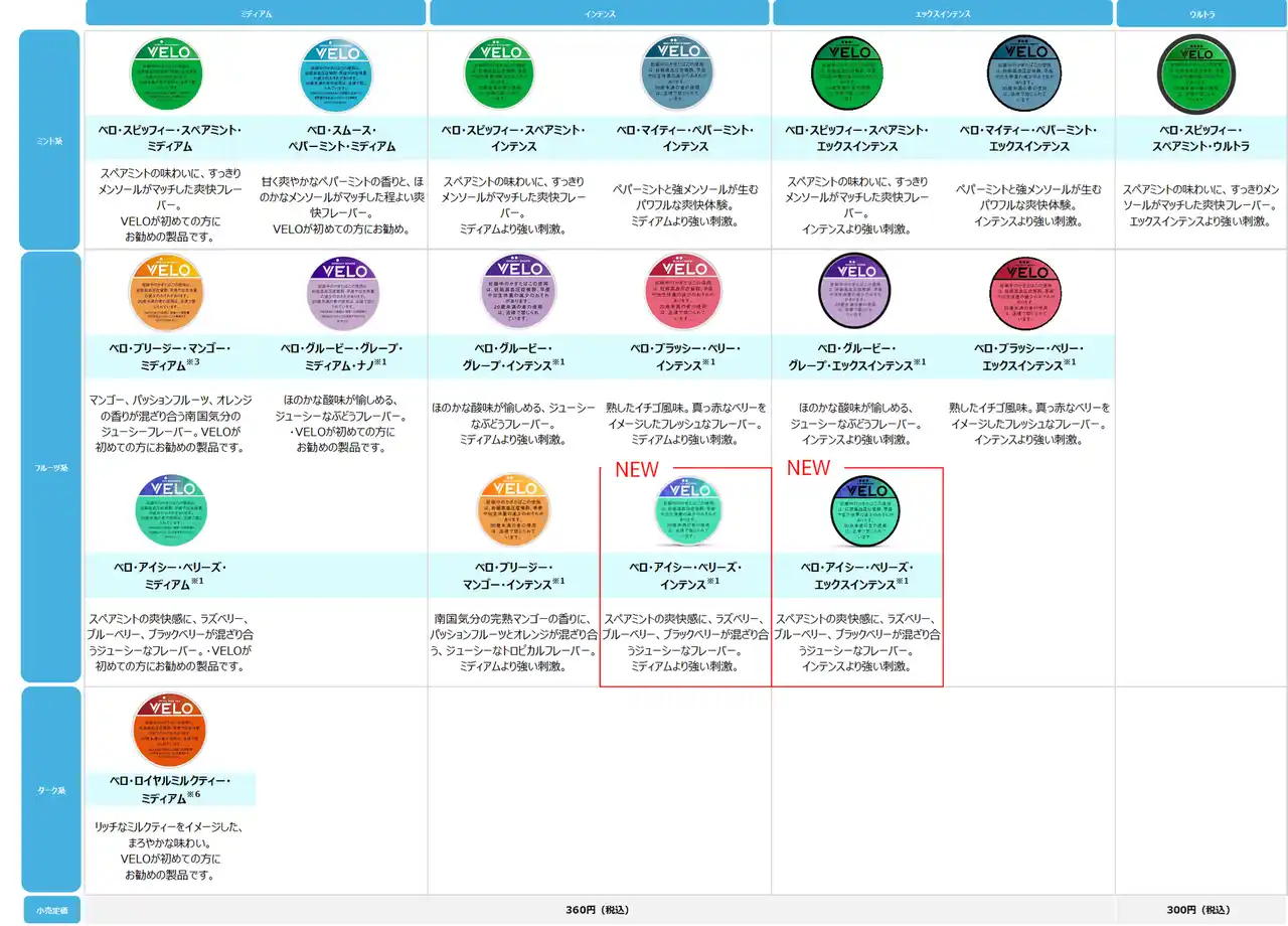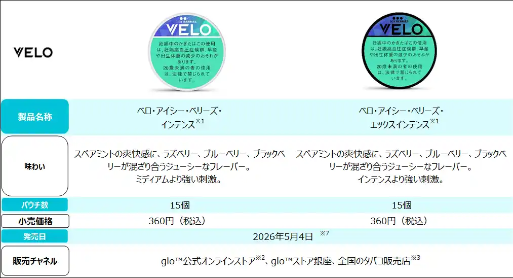 ブリティッシュ・アメリカン・タバコ・ジャパン合同会社(本社:東京都港区、代表:マウリシオ・ララ、以下「BATジャパン」)は、オーラルたばこ「VELO」から、新たに「ベロ・アイシー・ベリーズ・インテンス※1」および「ベロ・アイシー・ベリーズ・エックスインテンス※1」の2銘柄を、2026年5月4日よりglo(TM) & VELO オフィシャルオンラインショップ※2、glo(TM) ストア 銀座、および全国のたばこ販売店※3にて順次発売します。 |