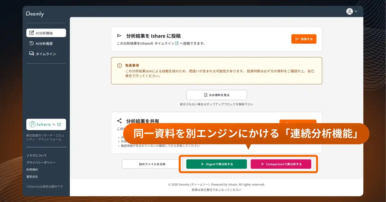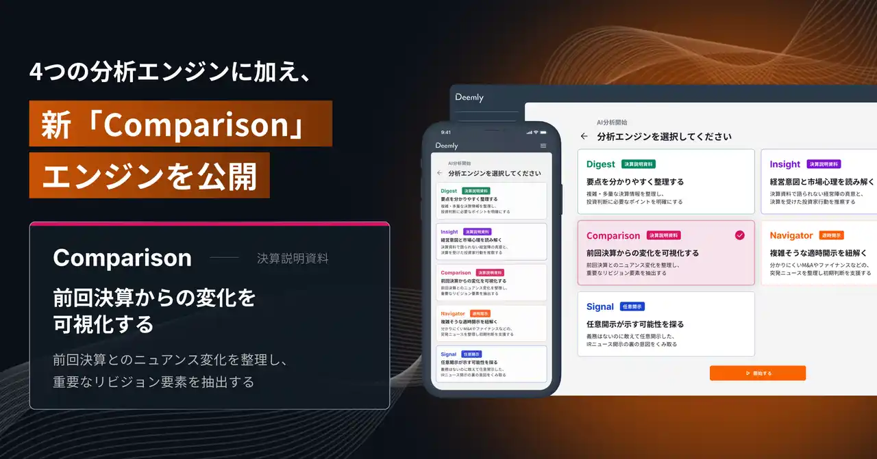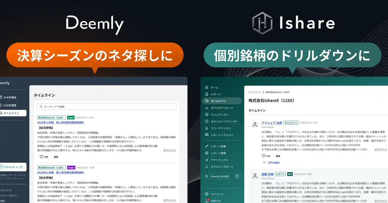 2026年4月24日、株式投資のリサーチ・コミュニティ・プラットフォーム「Ishare」を運営する株式会社Ishare(本社:東京都千代田区大手町、代表取締役:長谷川翔平)は、AIアナリストレポート生成エンジン「Deemly」において、決算分析の機能拡張を目的とした複数のアップデートを実施いたしました。 |