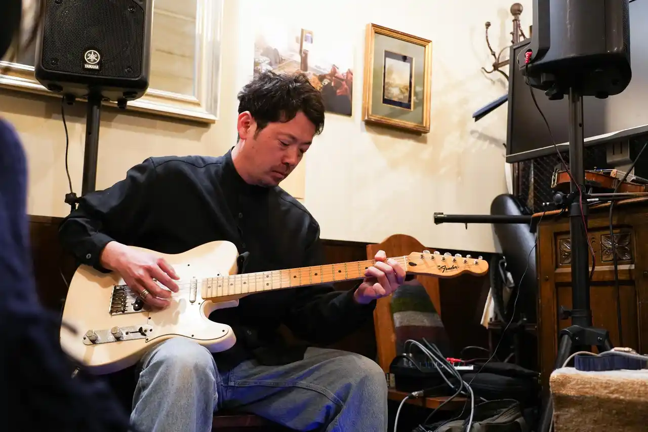 サウンドアーティスト・山本啓氏が、トルコのイスタンブールでシリア人アーティストたちとセッションと対話を重ねながら生み出したオリジナル楽曲を生演奏しました。現地で録音した伝統楽器ウードのシリア音楽に、エフェクトとループを組み合わせた繊細な音世界が、食事の場に静かな感動を重ねました。QRコードつきカードから楽曲を持ち帰ることもでき、体験をその場限りで終わらせない設計がなされていました。参加者からは「現地のエピソードを聞いた上で、山本さんの音楽を聴いたら、涙が出そうになった」という感想が届いています。 |