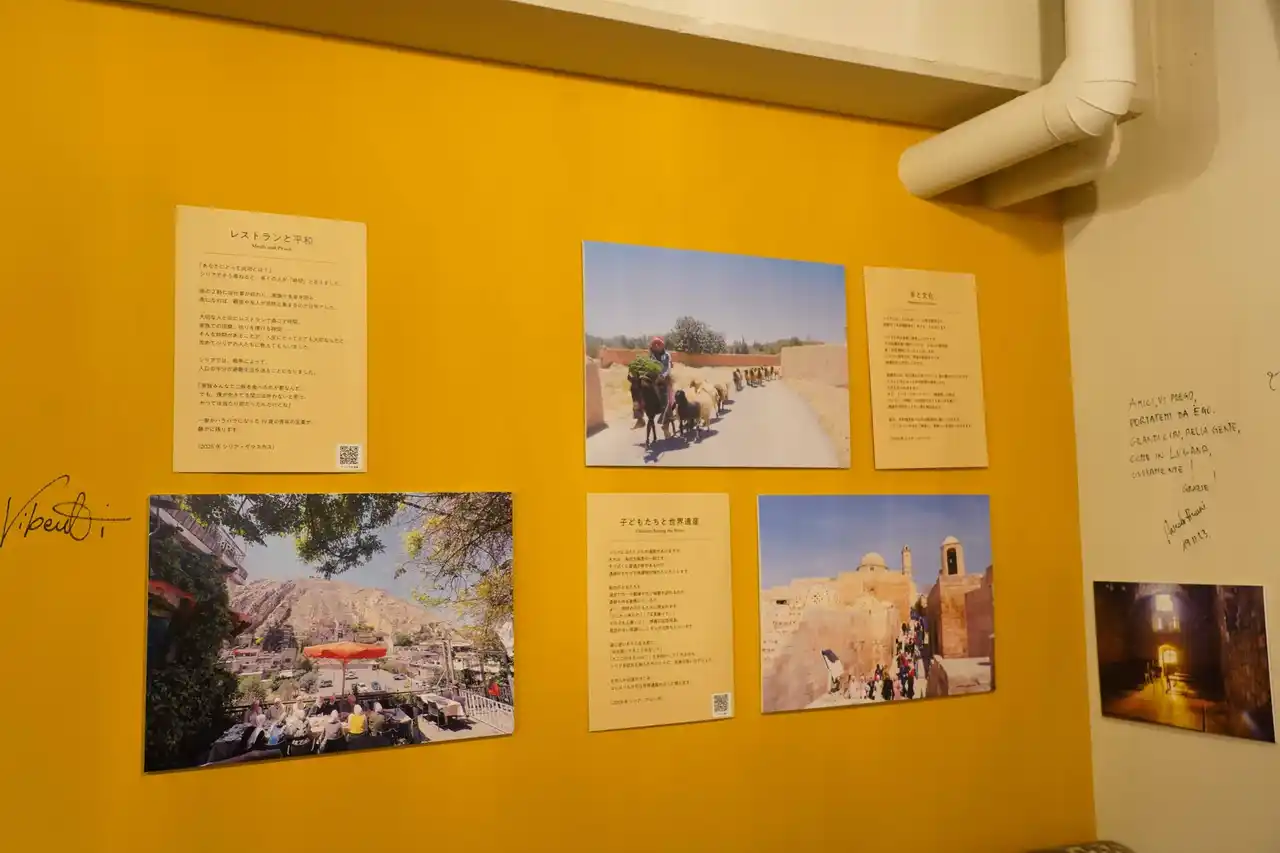 シリアの人々や日常の風景を収めた写真が会場の壁に展示されました。各写真には、Piece of Syria 代表・中野貴行が「個人的に感情が動いた体験」を綴ったキャプションが添えられ、さらにQRコードから関連動画を視聴できる構成に。一枚の写真が、文字と映像の三層で立体的に語られました。 |