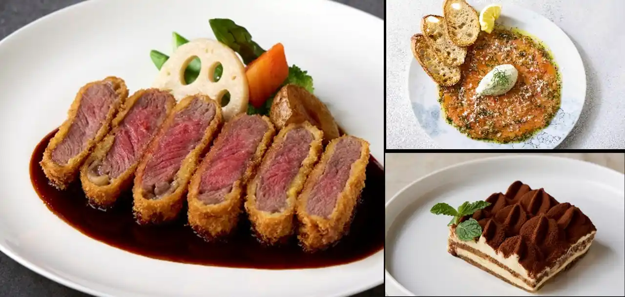 左:国産牛のビーフカツレツ 赤ワインデミグラスソース、右上:青森サーモンのスモーク レムラードソース、右下:クラシック ティラミス |