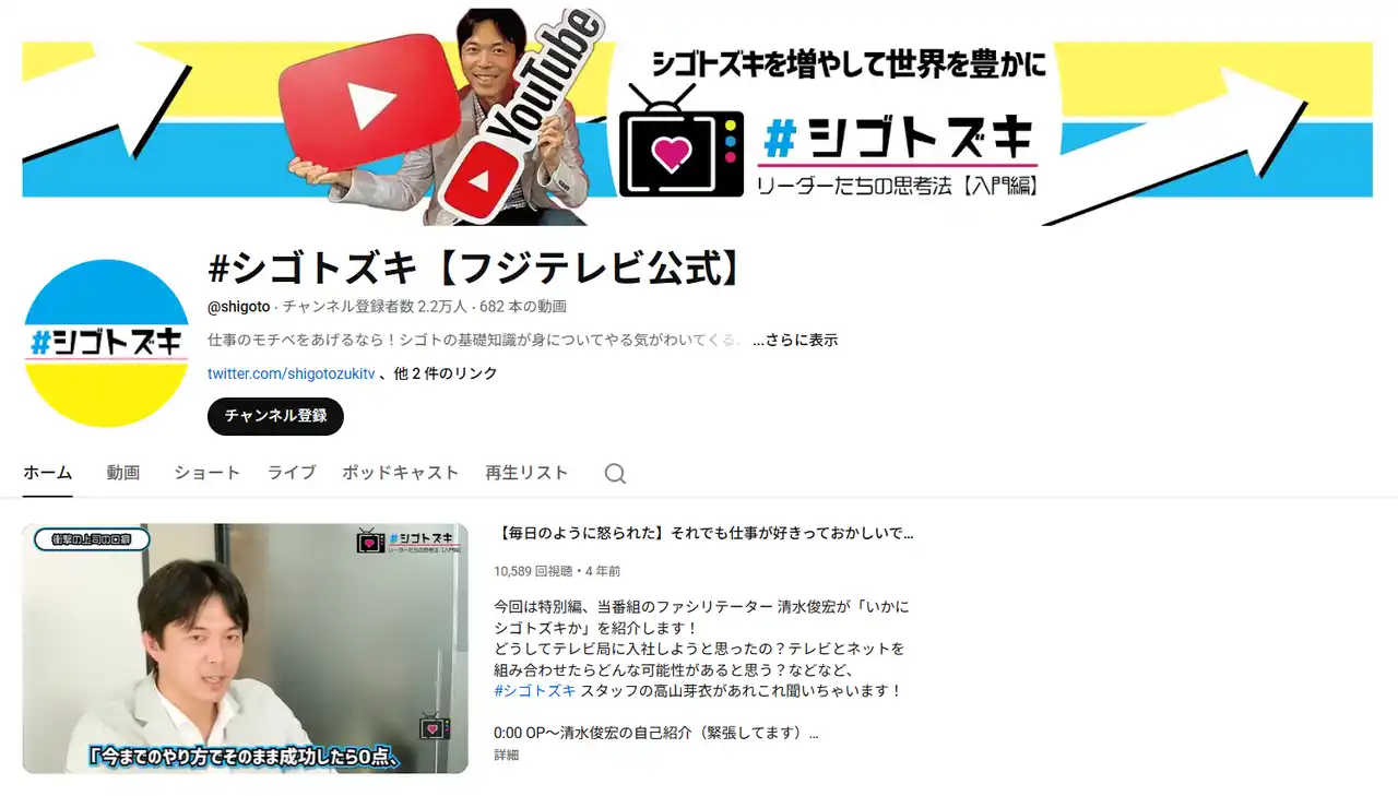 「#シゴトズキ」は、清水 俊宏氏がファシリテーターを務めるフジテレビ公式YouTubeチャンネルです。ビジネスパーソンやこれから社会に出る若者に向け、仕事の思考法やスキルを伝える経済番組として、様々な業界の第一線で活躍する経営者やリーダーを「シゴトズキマイスター」としてゲストに招き、インタビュー形式で彼らの成功体験や失敗談、仕事への哲学を深掘りします。 |