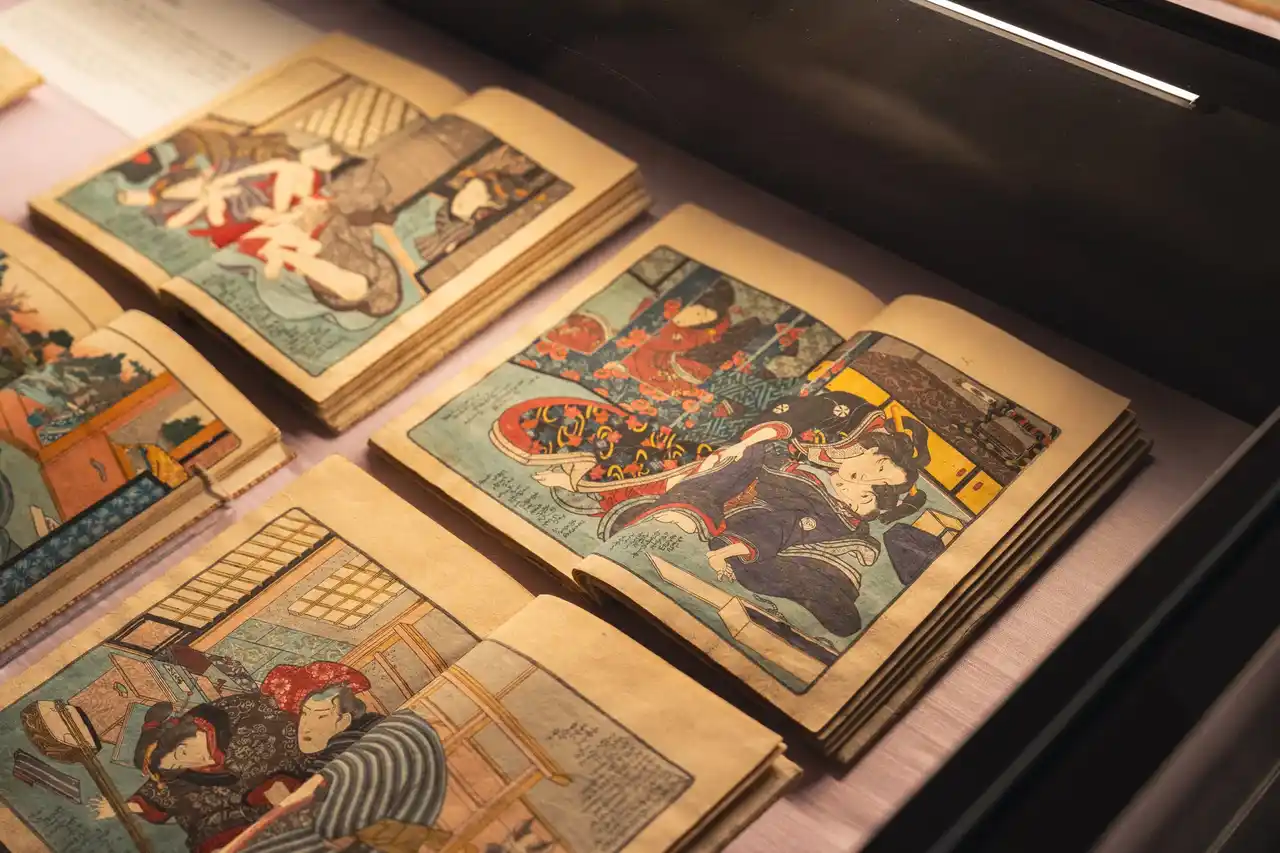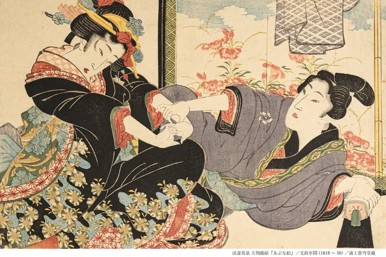 展示作品の中でも、その圧倒的な情報量とユーモアで来場者の目を釘付けにしているのが、渓斎英泉の『枕文庫(まくらぶんこ)』です。 |