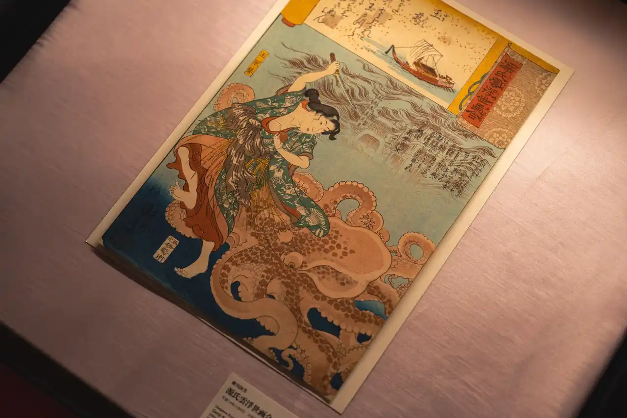 本展ではまた、《蛸と海女》が北斎の独創に留まらず、北尾重政や勝川春潮らの先行作品を北斎が模倣して描いたものであることに光を当て、さらに『日本書紀』の「海女の玉取神話」にまで遡る系譜を一望できる展示を行っています。古典を引用し再構築する──江戸の絵師たちが繰り広げた「サンプリング&リミックス」の面白さも、本展ならではの体験です。 |