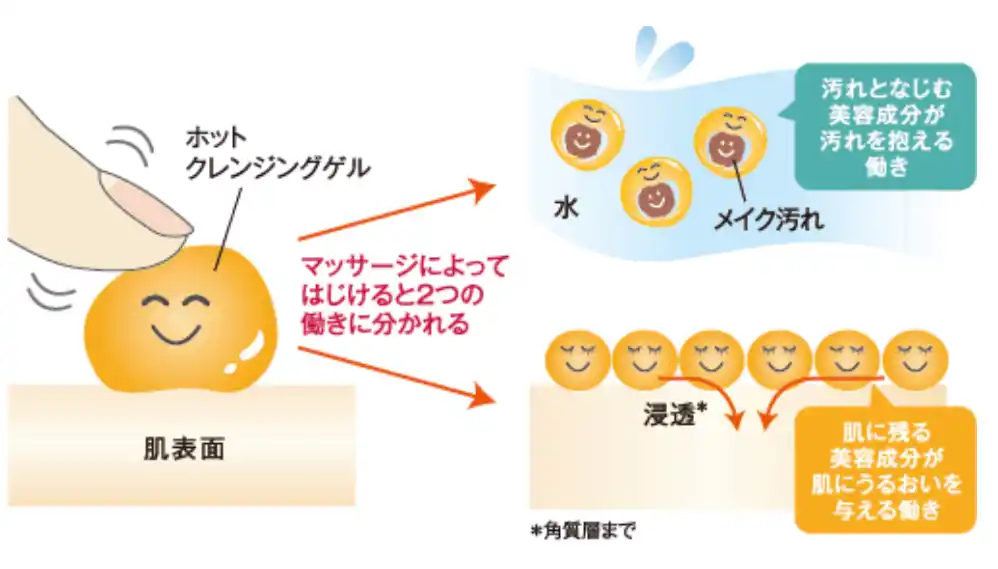 | 温感マッサージを施すことで血行がよくなった肌は、毛穴まわりがゆるみ、美容成分が角質層まで浸透しやすい状態です。ホットクレンジングゲル マッサージプラスは、美容成分のバランスを変更 。 エイジングケア*¹のための成分をさらに追加 することで、若々しく、ふっくらツヤやかな肌へと導きます。 | |||||||||||||||||