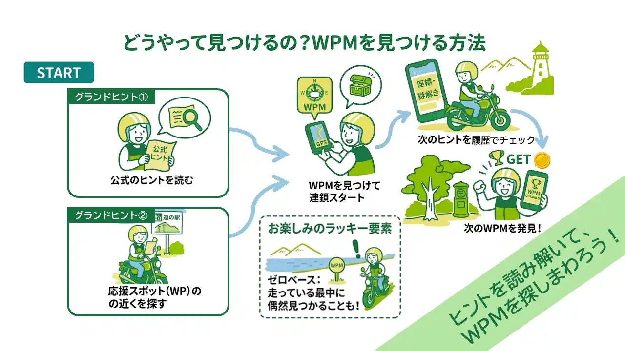 参加者は「グランドヒント」を皮切りに、地図上に明示されていない地点「WPM」を探索します。また、地点によっては発見後に次なる地点へのヒントが提示される「階層式構造」を採用。一つ一つ謎を解いていく体験そのものを、新しいツーリングの遊び方として確立しました。 |