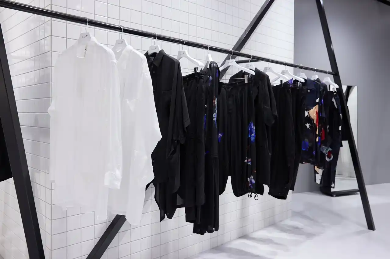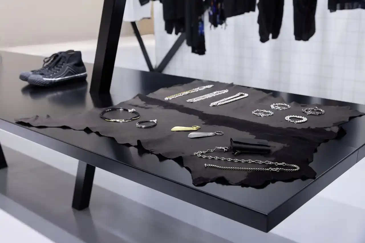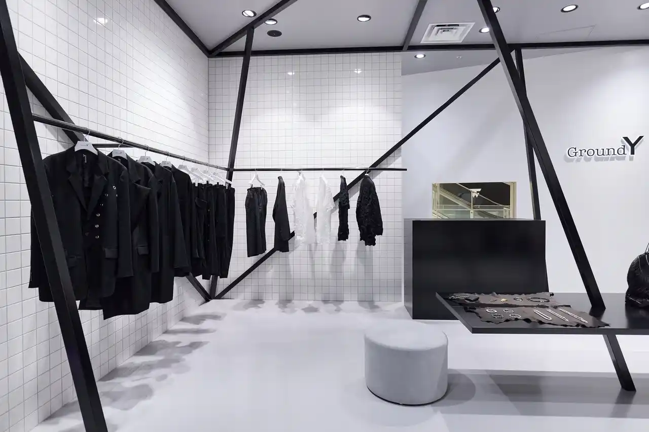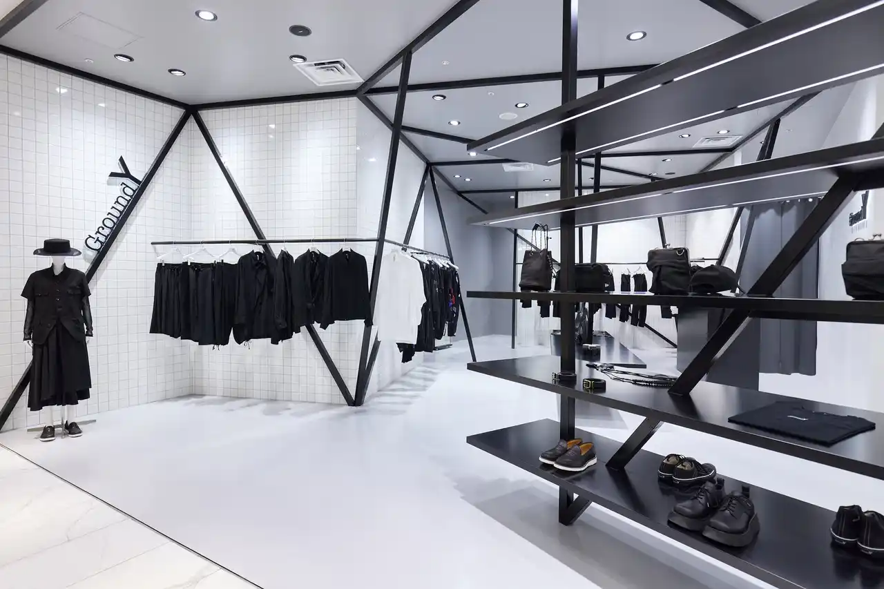 店舗デザインは、白いタイルに黒いフレームが重厚感を加え、白と黒のコントラストが際立つ空間に仕上がりました。革新的でありながら、親しみやすいファッションへのアプローチを体現するGround Yの哲学を多面的に表現しております。心斎橋PARCOでの新たな空間にて、ブランドの世界観を引き続き提案してまいります。 |