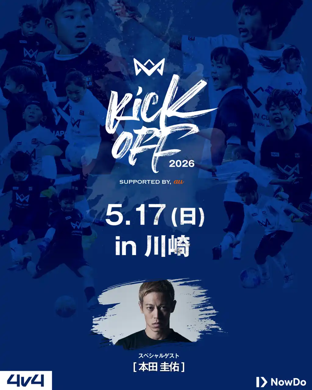 Now Do株式会社(所在地:東京都新宿区、代表取締役:本田圭佑)が運営する4人制サッカー全国大会「4v4」は、2026年シーズンの幕開けとして「4v4 KICKOFF 2026 Supported by au(以下、本企画)」を5月17日(日)に開催いたします。本企画は、全国各地で切磋琢磨する仲間たちが同日に一斉にキックオフを迎えることで、4v4を通じて日本中が一つになり、新シーズンの輝かしいスタートダッシュを鮮やかに飾る特別な「無料大会」です。 |
