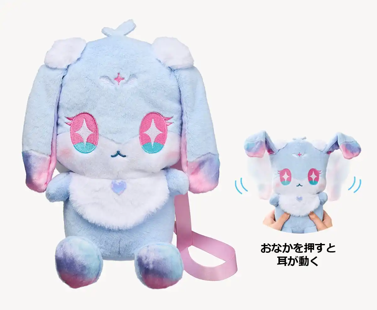 フォーチュデザインのぬいぐるみポシェットです。ファスナーを開けるとミラーパクトなどのアイプリグッズが収納できるサイズで、おなかを押すと耳が動くギミックが付いています。ぬいぐるみとしても楽しめます。 |