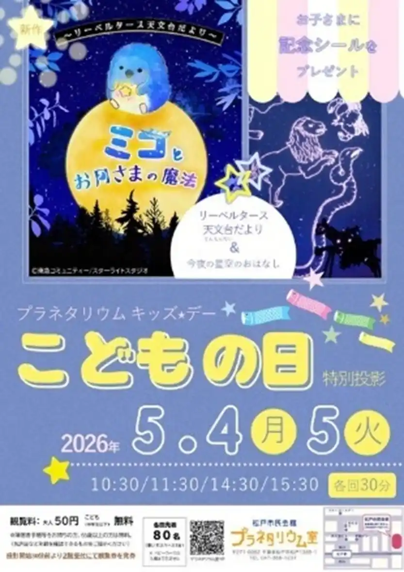 松戸市民会館内にあるプラネタリウム室「NAOKO SPACE PLANETARIUM」は、ドームの直径8m、座席は80席と小さなプラネタリウム室です。ゴールデンウイークには、特別投影「キッズ★デー こどもの日」として子ども向けのプログラムが行われます。プログラムは「ミコとお月さまの魔法」(上映時間30分)。来場した子どものうち先着300人には、特製シールをプレゼントします。プラネタリウム室の名前の由来は、本市出身の宇宙飛行士で、松戸市天空スーパーアドバイザー兼松戸市民会館名誉館長の山崎直子さん。彼女自身も、幼少期からこのプラネタリウム室に足しげく通ったそうです。昭和53年の開設から変わらず愛されるプラネタリウムで、夜空に思いを馳せることができます。 |