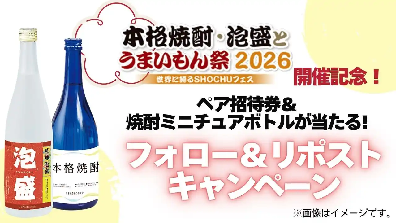 「本格焼酎・泡盛とうまいもん祭2026~世界に誇るSHOCHUフェス~」の開催を記念してSNSキャンペーンを実施!イベント公式アカウントをフォローいただき、指定の投稿をリポストいただくと40名さまにペア招待券と焼酎ミニチュアボトル(100ml※銘柄は選べません)をプレゼント!この機会にぜひご参加ください! |