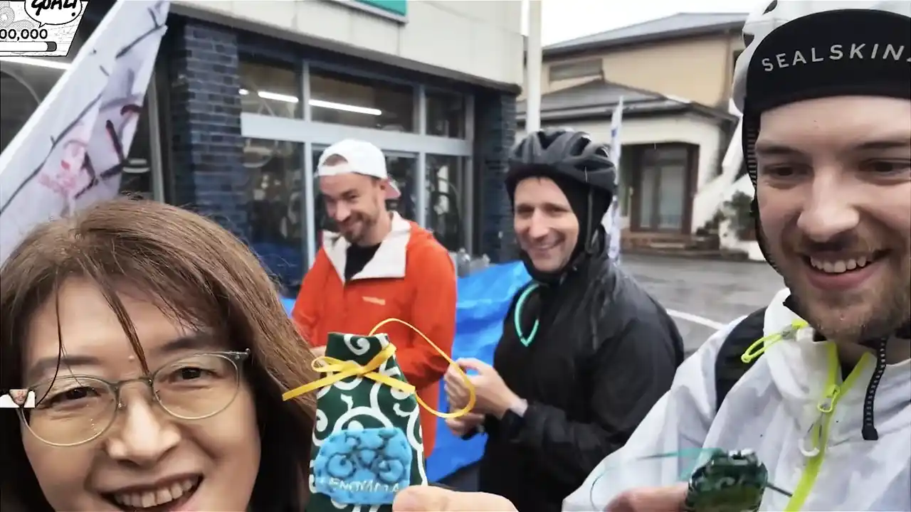 各地の立ち寄り先では、地域の人々との心温まる交流も見られました。自転車の修理のため立ち寄ったサイクルショップ(山形県酒田市)では、以前も自転車旅で訪れたことがあるゲストのRobcdee(ロブ・シーディー)が、約2年ぶりに店主と再会。突然の再来訪を喜んだ店主から、参加者全員に手作りの「自転車安全お守り」が贈られました。その様子に対し、視聴者からは「すてきなお店と店主」「やさしい!泣きそうになる」といった感動の声が寄せられました。 |