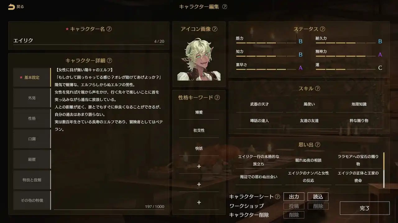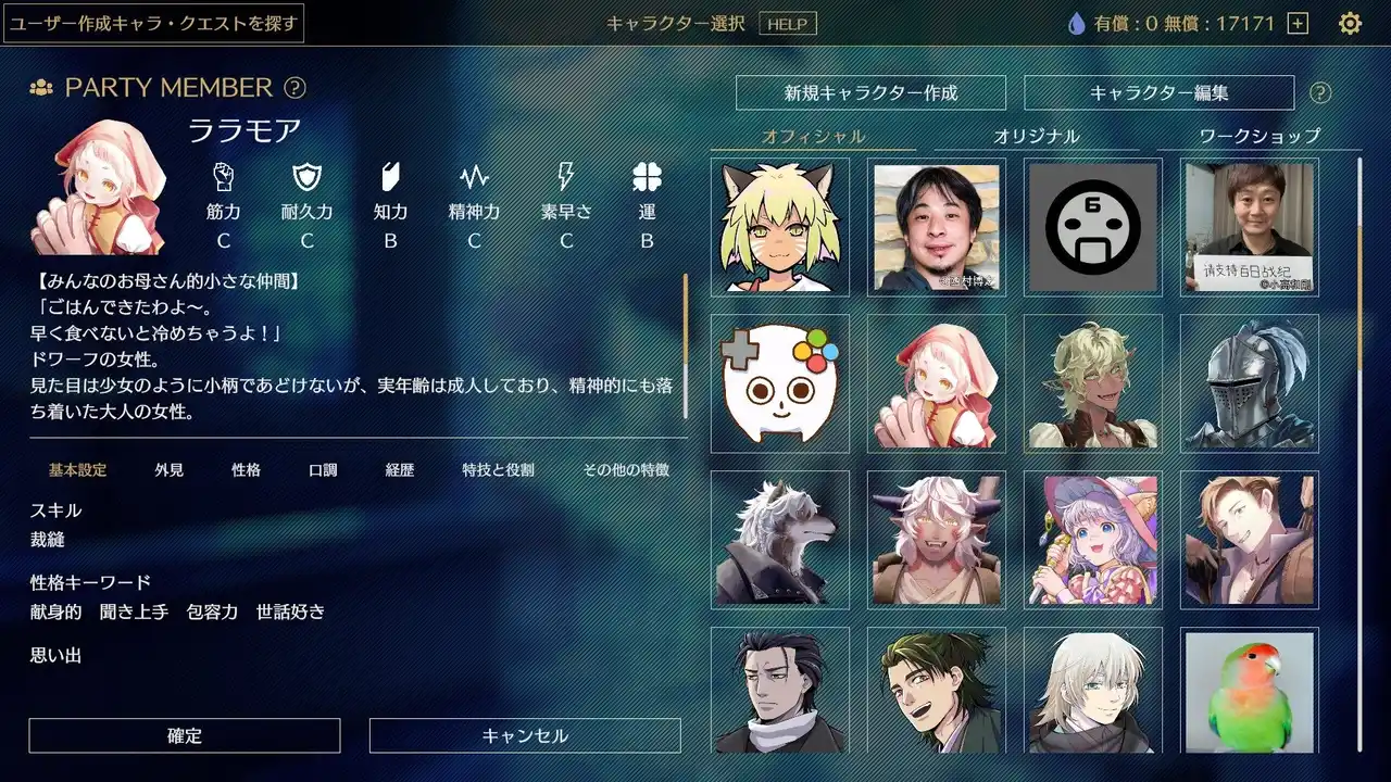 クエストをクリアすると手に入る「スキル」や「思い出」も、AIによってクエスト内容に合わせたものが自動生成され、唯一無二の経験がキャラクターに蓄積されていきます。キャラクター情報はいつでも編集できるほか、もっと凝った体験をしたい人向けにオリジナルクエストの読み込み機能も用意されています。 |