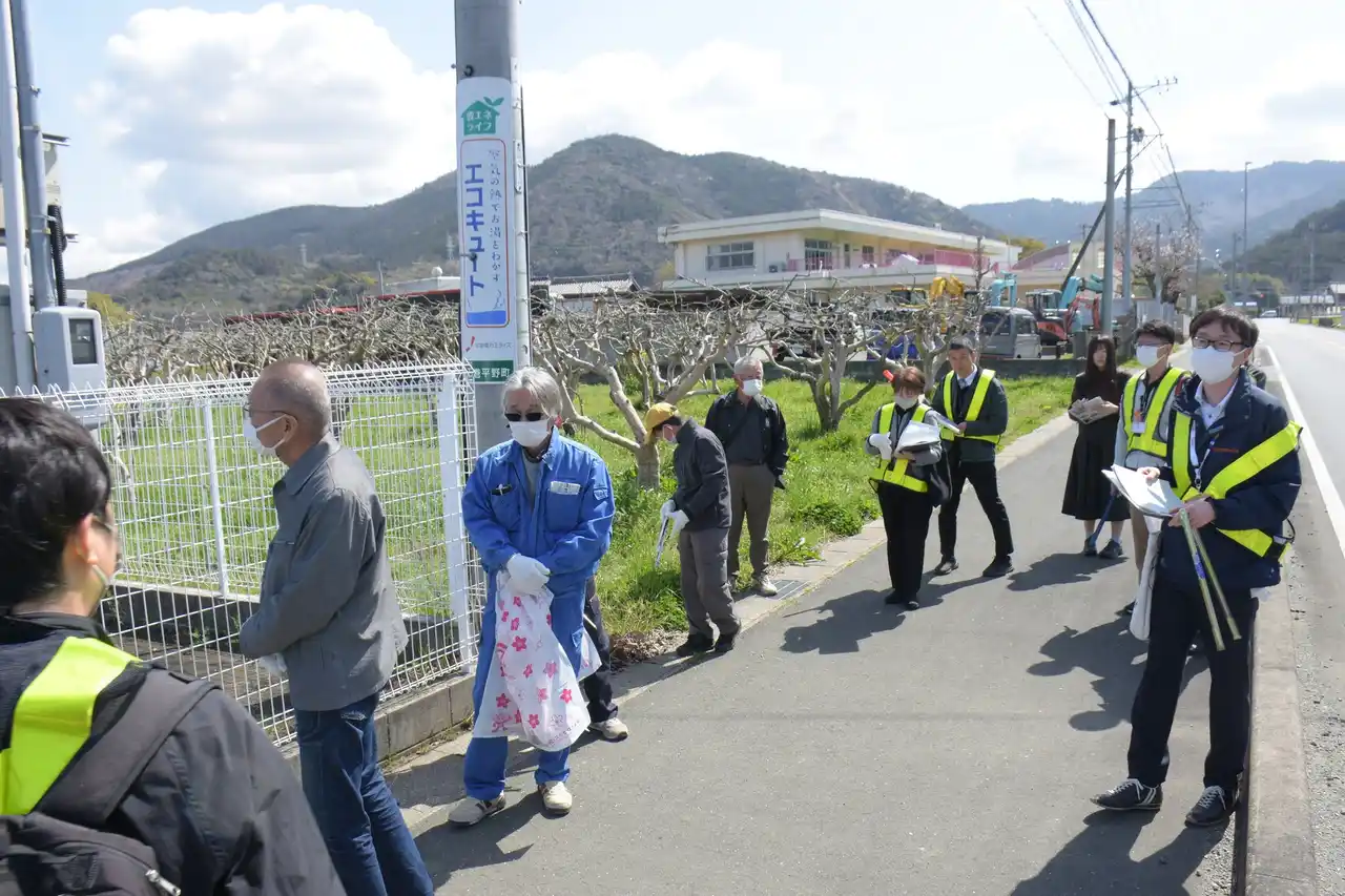 発出式の後には、市職員と地域住民が2班に分かれ、地域を巡視。現地を歩きながら、監視のポイントや注意点について、理解を深めました。 |