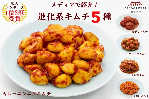 商品内訳:カレーニンニクキムチ、梅干しキムチ、オリーブキムチ、干し鱈キムチ、つぶ貝キムチ