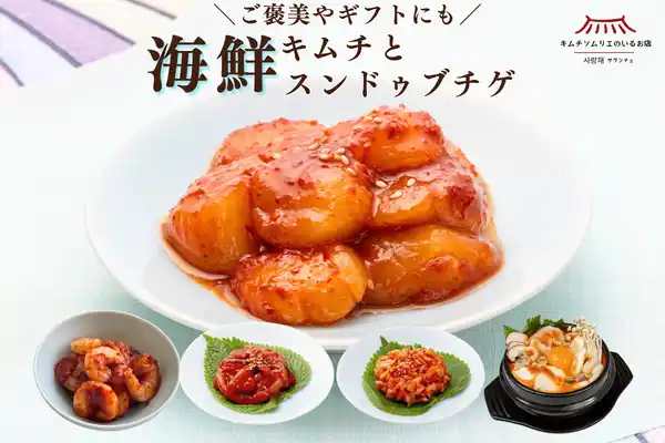 商品内訳:帆立キムチ、えびキムチ、いかキムチ、つぶ貝キムチ、海鮮スンドゥブチゲセット