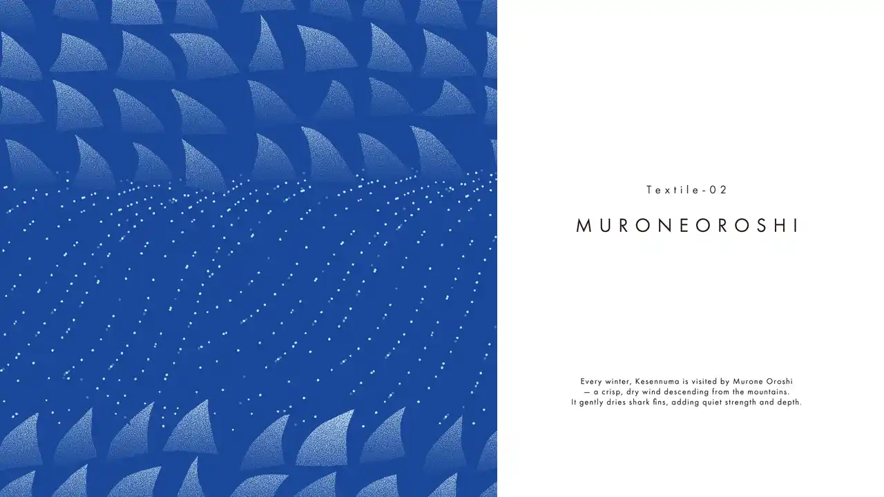 気仙沼の名産品・フカヒレ作りに欠かせない「室根おろし」と呼ばれる風を反映しています。冬の室根山から吹きつける、手の切れるような冷たい風です。この冷たさが、天日干しをしているフカヒレを乾燥させます。吹かれたフカヒレがぶつかり合って鳴らす“カランカラン”という音が、完成の合図になっているそう。過酷な環境を味方に変える力強さを届けたいと思い描きました。 |