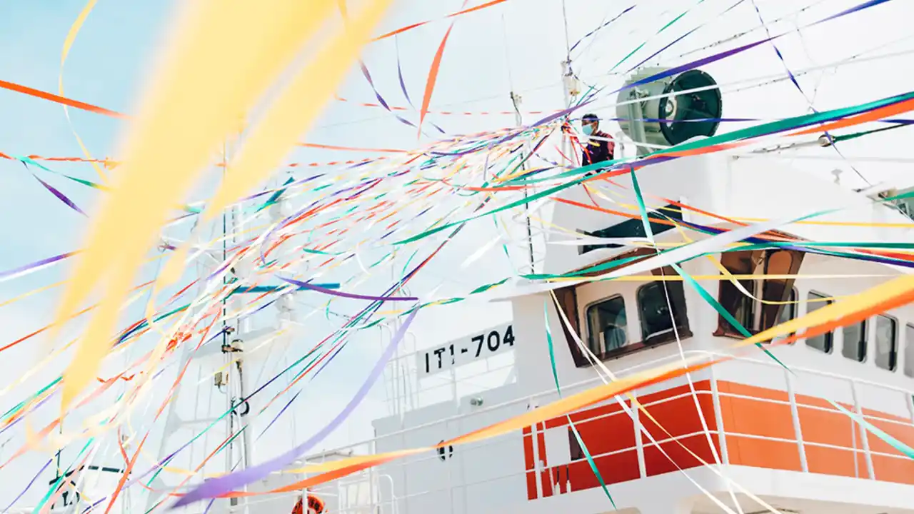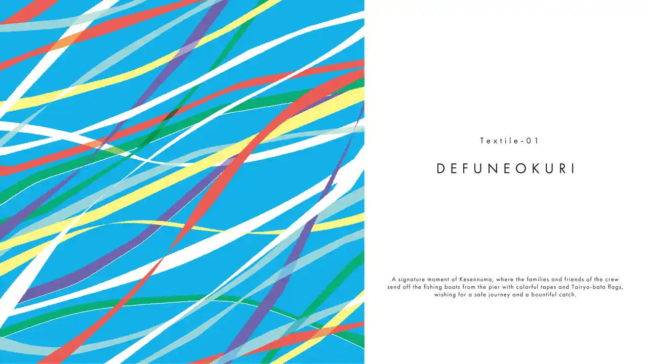「出船おくり」という気仙沼の伝統行事のワンシーンを切り取ったもの。いざ出航と意気込む船を、乗組員の家族や友人らは、色鮮やかなテープと福来旗(大漁旗)で見送るというのが慣例です。航海の安全と大漁を願う温かく賑やかな景色をテキスタイルに落とし込むことで、プロダクトを使う方の挑戦を見守る存在でありたいという想いが込められています。 |