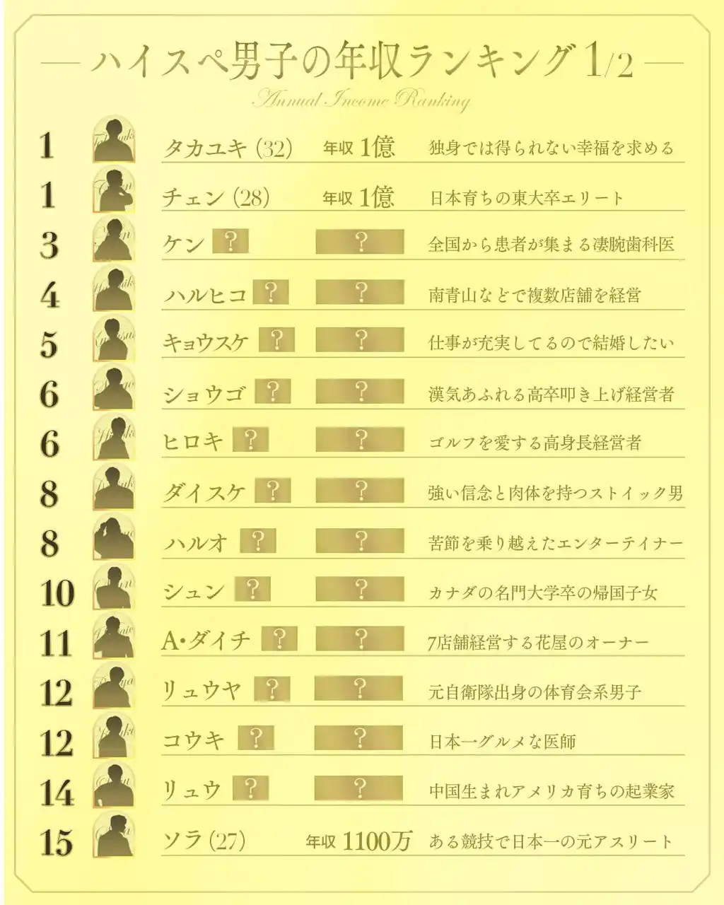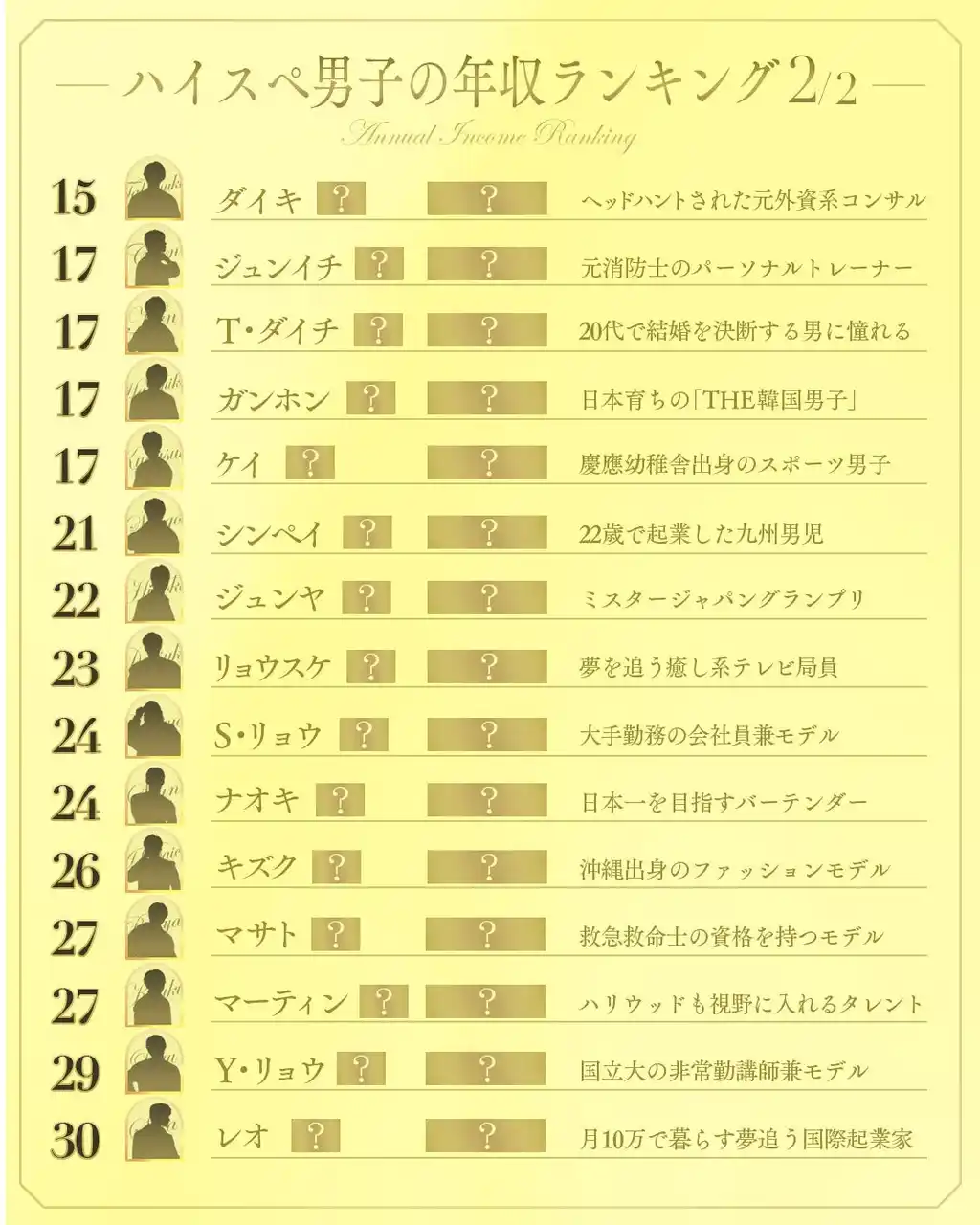今回公開したランキングは、本プログラムに参加する厳選された”ハイスぺ男性”総勢30人を、年収順に一覧化したものです。平均年収は2,000万円超、平均年齢は30.6歳という超ハイスペックな30人が集結。中には、年収1億円の経営者や東大卒エリート、グローバル起業家、その他にも医師やミスタージャパングランプリなど、個性豊かなメンバーが集っています。 |