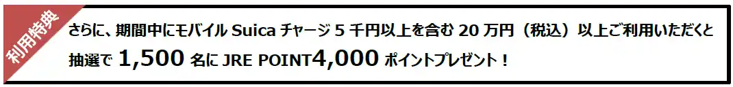 ※利用特典は、モバイルSuicaチャージ5,000円以上*を含む200,000円(税込)以上利用された方の中から、抽選で1,500名さまへJRE POINT(期間限定ポイント)4,000ポイントをプレゼントします。*定期券購入時のSuicaチャージを除く |