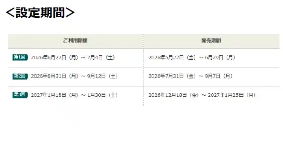 ・2026年5月1日(金)~9月30日(水)までに「大人の休日倶楽部」ホームページからWebでお申し込みされた方で、2026年5月1日(金)~10月31日(土)までに「大人の休日倶楽部カード」へ入会された方が対象です。 |