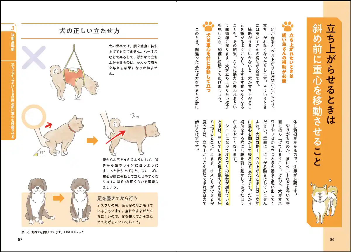 介護はなにより飼い主が体力的にも、精神的にも負担になりすぎないことが大切です。そのため、早い段階から介護をラクにする心構えといった内容、そして立ち上がり補助や寝返り補助まで、実践的なノウハウまで幅広く紹介しております。 |