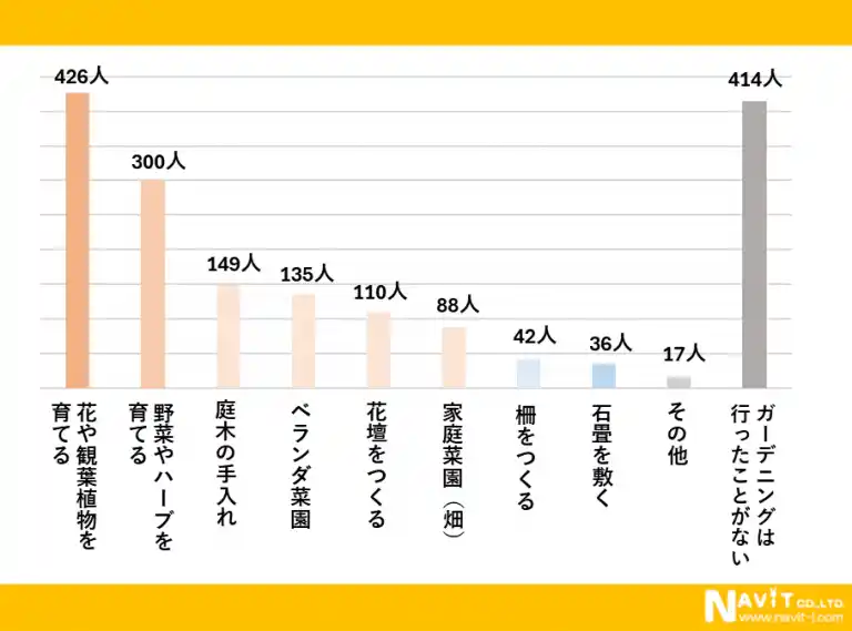 | 複数回答で回答をいただきました。一番多かったのは「花や観葉植物を育てる」で426人、次に多かったのが「野菜やハーブを育てる」で300人、3番目に「庭木の手入れ」が149人と続いています。個人的には「柵をつくる」が42人、「石畳を敷く」が36人と、本格的なDIY系のガーデニングをされている方もいることに驚きました。 | |||