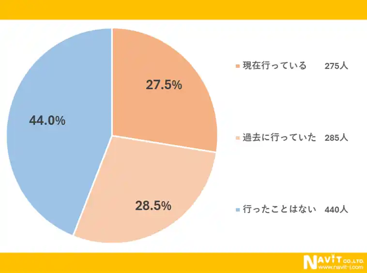| こちらは、現在ガーデニングを行っているかどうかについてのアンケートです。「現在行っている」と回答した人が27.5%、「過去に行っていた」が28.5%、「行ったことはない」が44.0%という結果になりました。現在進行形で行っている人と過去に行っていた人を合わせると56.0%と、半数以上の人がガーデニング経験者であることがわかります。 | |||