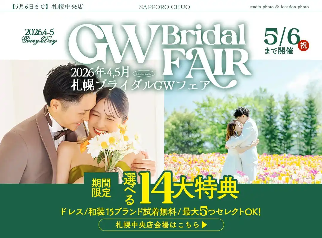 有限会社三景スタジオ(本社:北海道旭川市/運営:写真工房ぱれっと)は、札幌エリアでフォトウエディングを検討されているカップルへ向けた期間限定イベント「札幌GWブライダルフェア」を、写真工房ぱれっと サッポロファクトリー店にて2026年5月6日(水・祝)まで開催します。 |