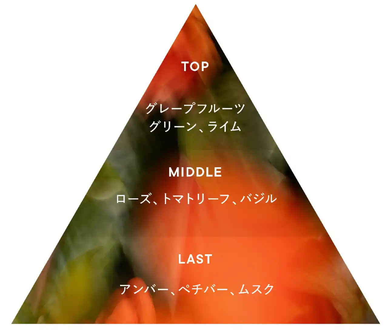 みずみずしいフルーツとハーバルグリーンを主軸にローズが溶け合うフルーティーグリーンフローラルの香り |