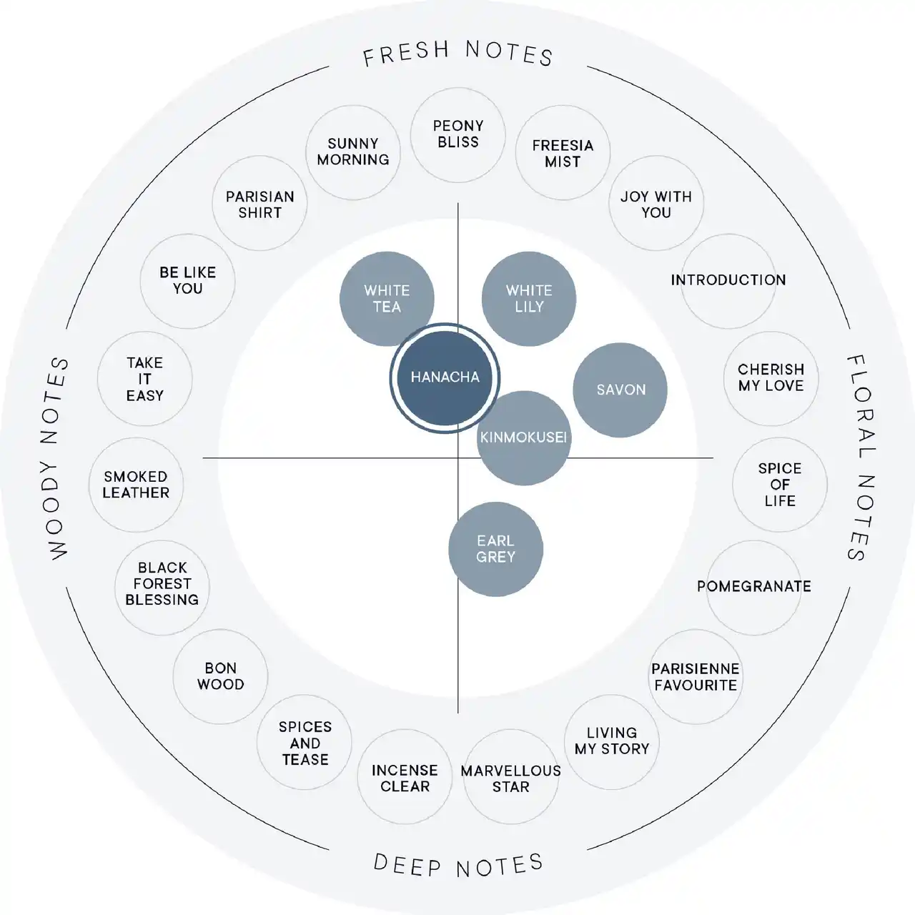 このように香港の茶文化からイメージした“花茶”のトップには、みずみずしい柑橘が爽やかに広がり、ミドルにはバジルなどのハーバルグリーンとナチュラルなローズが溶け合い、ラストはムスクのやさしい温もりが全体を包み込みます。高温多湿な香港の気候になじむ、リフレッシュ感に満ちた爽やかな香りです。 |