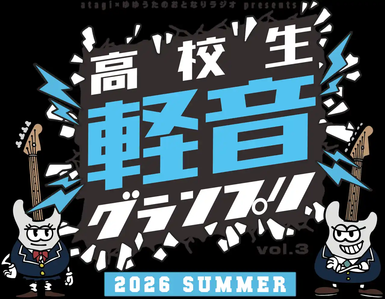 「第3回 高校生軽音グランプリ2026夏」は、「atagi×ゆゆうたのおとなりラジオ」が主催となる高校生バンドの全国大会。2026年8月20日に横浜みなとみらいで開催される決勝戦では、動画審査で選ばれた高校生バンドがオリジナル曲を生放送で生演奏。プロのミュージシャンが審査し、高校生No1バンドを決定する。 |